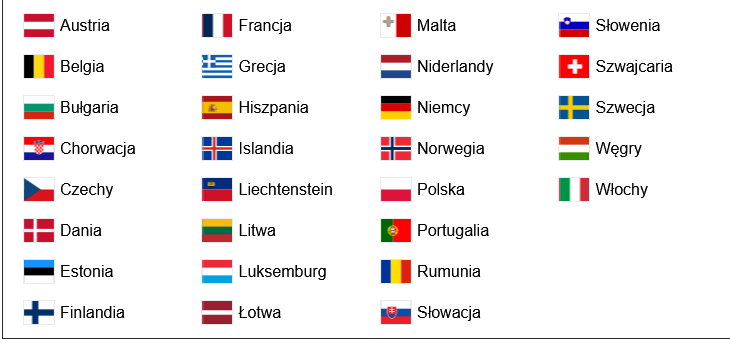 Австрія, Бельгія, Болгарія, Хорватія, Данія, Естонія, Фінляндія, Франція, Греція, Іспанія, Ісландія, Королівство Нідерланди, Ліхтенштейн, Литва, Люксембург, Мальта, Німеччина, Норвегія, Польща, Португалія, Чеська Республіка, Румунія, Швейцарія, Швеція, Словаччина, Словенія, Угорщина, Італія, Латвія.