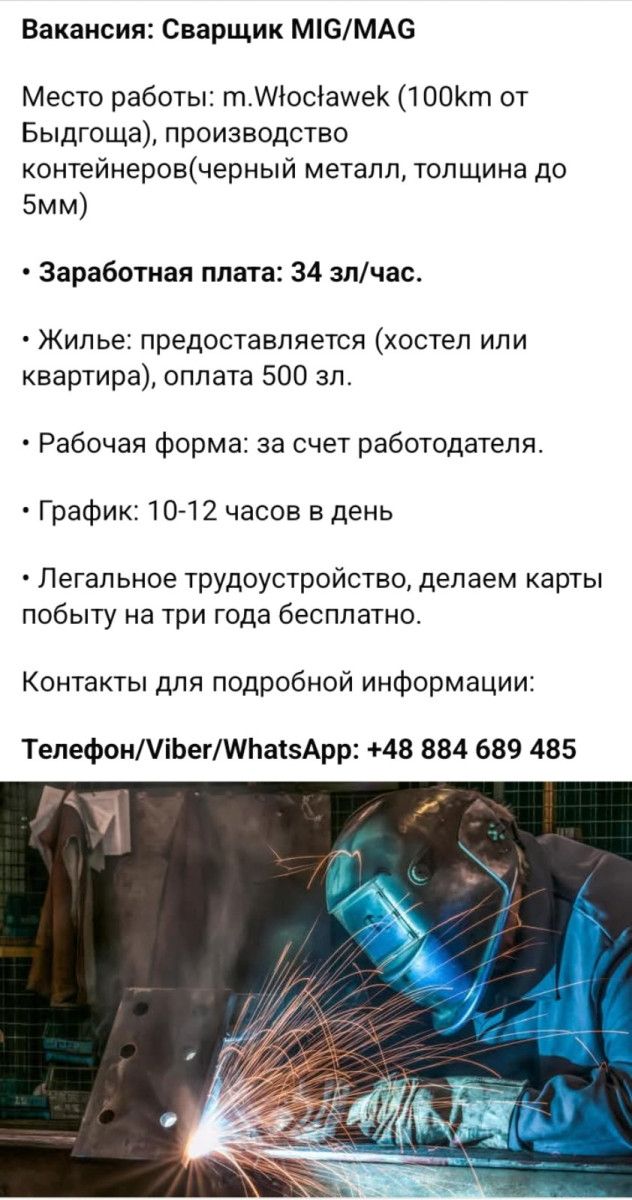 Если вы хотите работать в Польше и готовы постоянно совершенствовать свои навыки, свяжитесь с нами Контакт / Viber / WhatsApp: + 48 884 689 485 Предлагаем помощь в легализации документов и поиске подходящего, для вас, предложения по работе.
